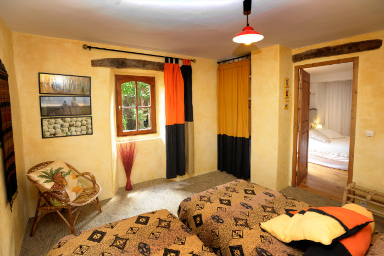 Bedroom “children or friends” invites you to travel in an African atmosphere with warm colors and a thematic decoration with carpet on the floor.